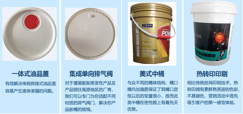 我们为客户提供膨胀性液体的排气解决方案,解决液体肥料膨胀问题以及油品运往高海拔地区时的桶内压力变化问题;提供塑料制提手 ,握感更为舒适且承重能力大幅提高  ;一体式包围油品盖,解决传统焊接小盖渗漏问题;配套为客户提供桶身丝网印刷及更为高档的热转印印刷方案 。